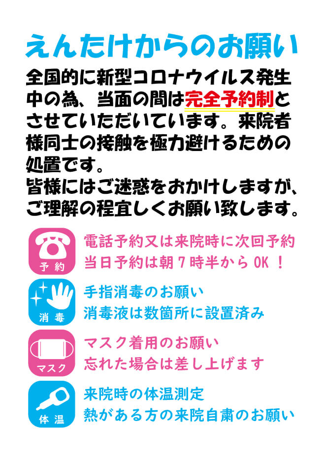 〈えんたけからのお願い〉 2021 4/13 お知らせ 2021.04.13 2021.04.13 新型コロナウイルス感染拡大防止に伴い以下の取り組みを継続して行っております。 皆様には色々とご迷惑をお掛け致しますが何卒宜しくお願い致します。 お知らせ