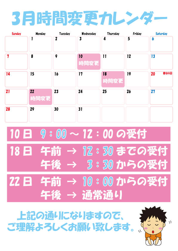 3月は色々と変則的な日程となりますので宜しくお願い致します。