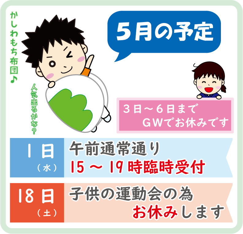 【5月の予定】 2024 4/19 お知らせ 2024.04.19 えんたけ整骨院の5月休みは上記の通りとなります。 皆様にはご迷惑をお掛け致しますが宜しくお願いします。 尚、ゴールデンウィーク前後は混雑が予想されますので早めの予約をお願い致します。 お知らせ