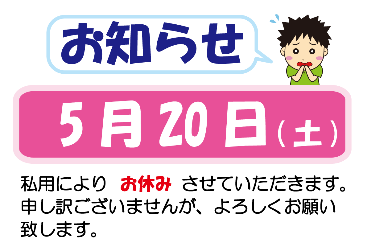 【5月の予定】 2023 5/18 Uncategorizedお知らせ 2023.05.18 20日(土)は私用によりお休みをいただきます。 皆様にはご迷惑をお掛けしますが宜しくお願い致します。 Uncategorizedお知らせ