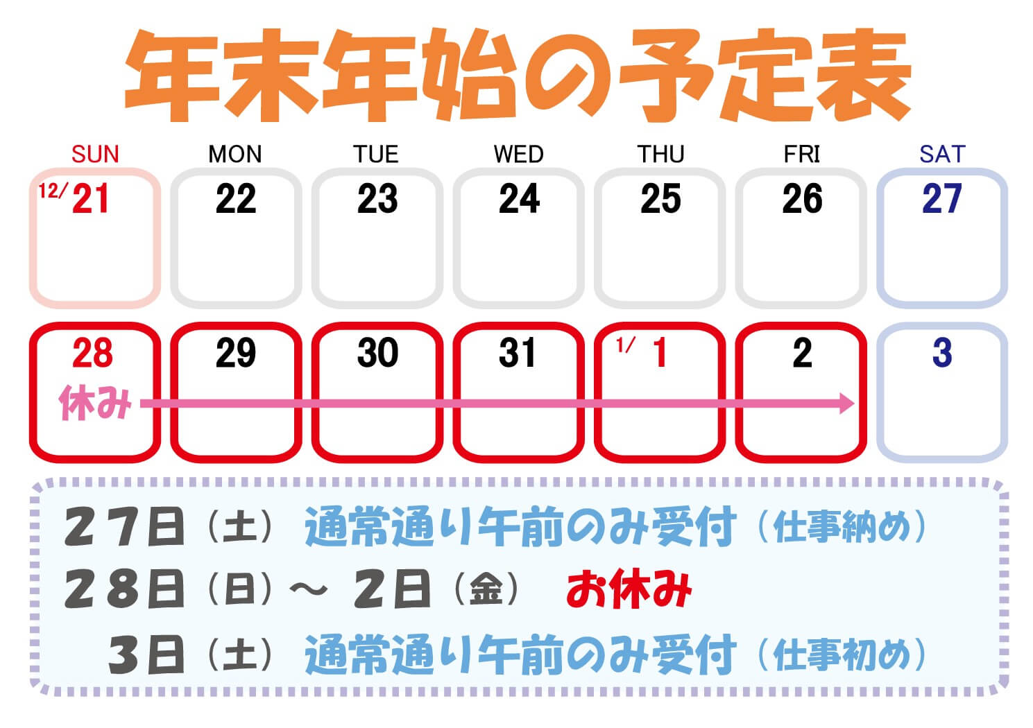 【年末年始の予定】 2025 11/21 お知らせ 2025.11.21 えんたけ整骨院ホームページを拝見していただきありがとうございます。 年末年始の予定は上記の通りとなりますので宜しくお願い致します。 お知らせ